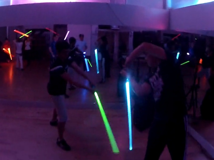 Light sabers. Shady alley. Fluorishes, choreography. Contagious laughter meditation. Indian buffet.