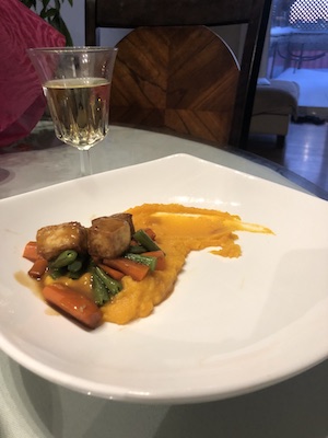 - Main course: air fried marinated tofu with soy ginger glazed veggies on a bed of sweet potato puree. Vegetable stock based sauce on top